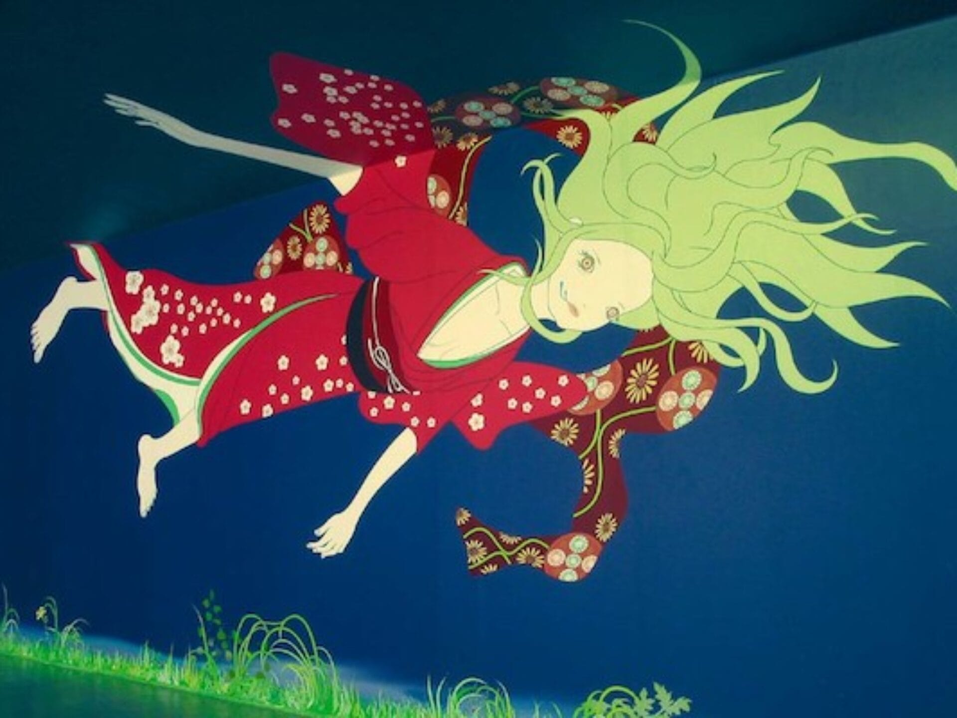 For the International 2002, Aoshima developed an enveloping 20 metre long mural that rose to ceiling height over a sloped wall. Her mythical narratives were well suited to jump off the page into a monumental frieze, mimicking billboards, wallpaper and the time progression in scenes from Japanese anime (animated movies).