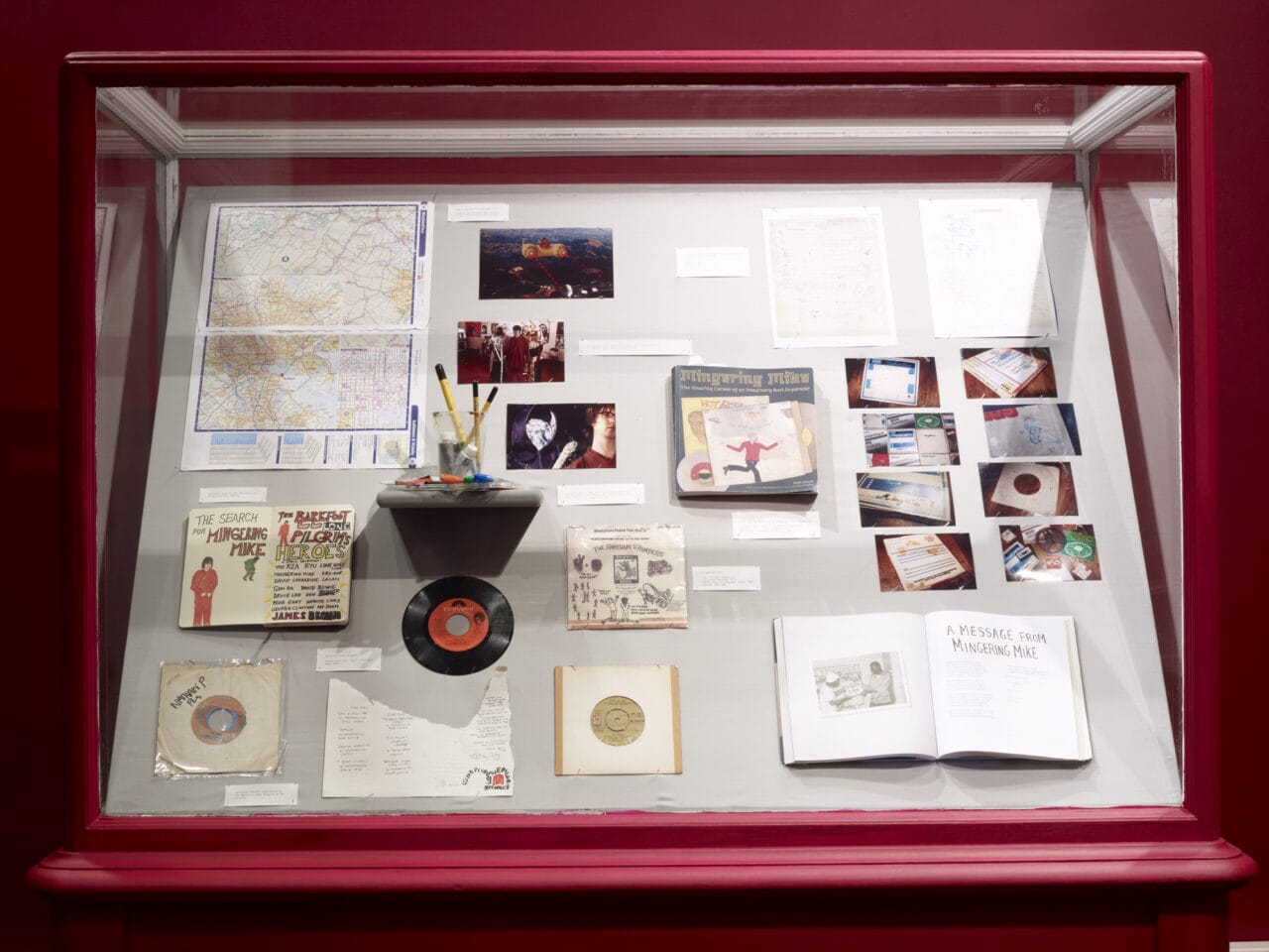 The resulting film saw Blandy insert himself into a cinematic brew of cosmic revelation, as he is guided towards Mingering Mike by jazz legend, Sun Ra – another musician who constructed his own mythical, extraterrestrial identity, claiming Saturn as his home. A semi-psychedelic meditation on the mythical nature of identity, race and authenticity, the film was accompanied by a ‘museum’ local history installation. Here ephemera such as photographs, posters, hand drawn record sleeves and other artefacts relating to the Lone Barefoot Pilgrim / Mingering Mike hybrid further blurred the distinction between fantasy and authenticity, between a so-called ‘outsider’ artist and an artist who was ‘for real’.