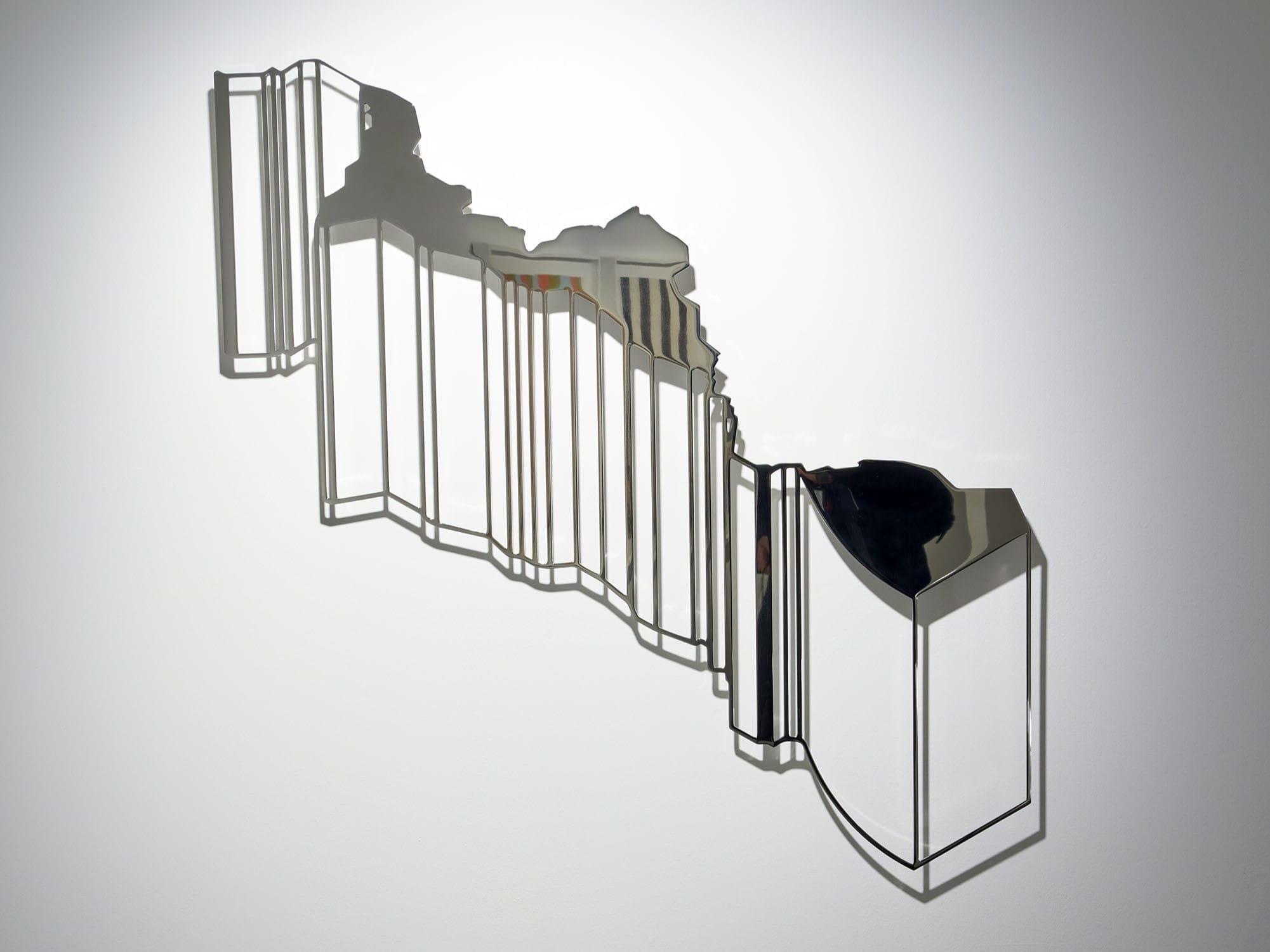 Dawit L. Petros examines the intertwined narratives of colonialism and modernity. He draws from his study of history to engage with the ongoing effects of displaced or forgotten histories. To the left, Petros’ series of screenprints explore popular representations of Eritrean askari, indigenous troops recruited into Italy’s colonial army. Eritrea was an Italian colony from the late 19th century until the Second World War. These works are created using images found in postcards and illustrated magazines collected and reproduced here by the artist. The vertical bands of colour and the number of each title reference the battalions under which askaris served. The abstract forms overlay the found imagery, obscuring it and referencing the unreliability and conflicting interpretations of historical documents from different sources. On the right, the steel sculpture commemorates the 1998-2000 border conflict between Eritrea and Ethiopia. Discrepancies in colonial era maps were significant catalysts for the war and are reflected here in the design which, although made of a solid material, alludes to fluidity and movement through its lines and reflective surface. Courtesy of the Artist and Tiwani Contemporary. Supported by Québec Government Office, London, and Tiwani Contemporary.