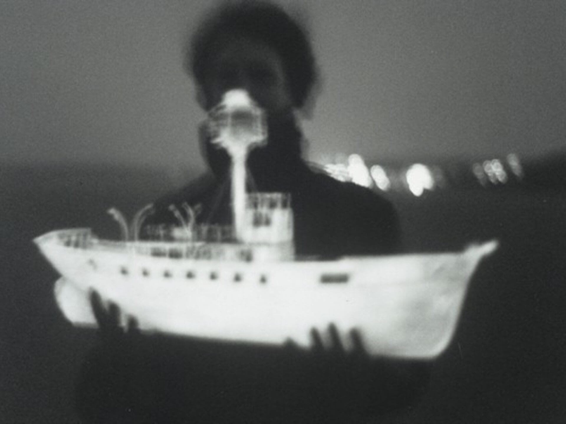 Cross braved the windswept channel in a dinghy one night to make a video of the glowing boat from the sea. A projection of this video was screened at dusk each night along the edge of the Mersey in Liverpool, where boats from Dublin used to moor. In years past these Irish boats depended on the light ship for their safe passage to England. At the Exchange Flags the artist also installed a phosphorescent model of the ship, made in preparation for the original project.