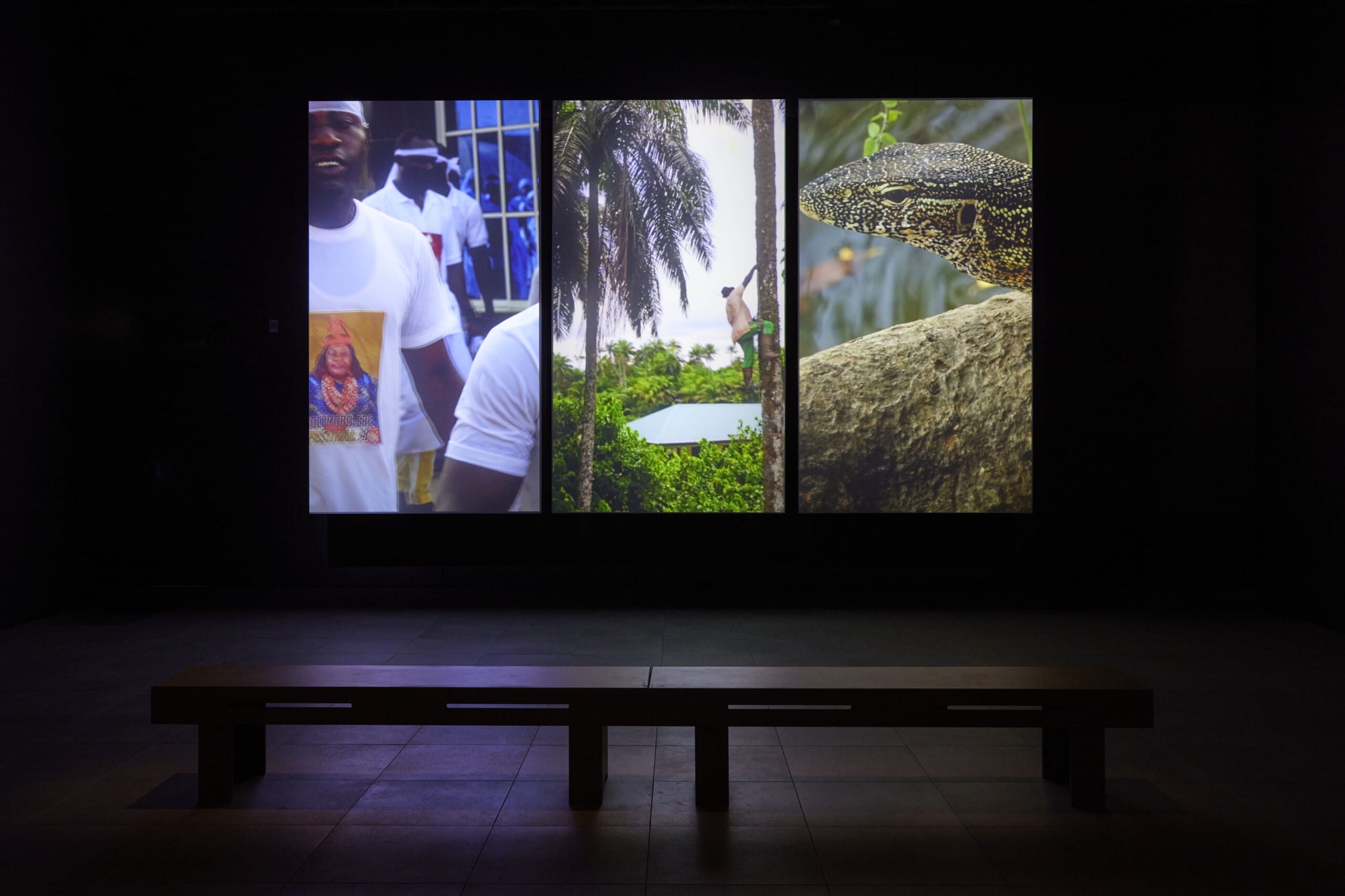 Linda Lamignan’s work questions the different ways in which humans treat and value the natural world, whether for profit or as something to be respected and protected. They work with materials connected to the industries, histories, living landscapes and cultural relations between West Africa and Europe. This new multi-screen video work references the artist’s ancestry, the knowledge systems of animism – the belief that objects, places, and creatures all possess a distinct spiritual essence – and geology. It centres around the long history of palm oil and petroleum extraction in Nigeria’s Delta State and the trade with Liverpool from the late 18th century to the present. Footage features the Amaseikumor festival, which takes place every year in Gbaramatu Kingdom. It is a huge celebration where different communities gather to share artworks, traditions, dances and rituals that praise ancestral deities – spirits or gods associated with a specific family or clan, believed to offer protection or guidance. These deities often take the form of natural or living beings, including Barugu (the Monitor Lizard who is a father figure, protector of land, a god of war and deity of the artist’s grandmother) and Egbesu (the god of justice that the artist’s great grandfather invoked as he fought against Portuguese colonialism). The film also features the Bobougbene community in Delta State, a community that is known for its local small-scale production of natural and organic palm oil. This element contrasts and relates to the history of large-scale palm oil production and exportation between Delta State and Liverpool. From 2006 to 2009, Tompolo, the former commander of the Movement for the Emancipation of the Niger Delta (MEND), invoked Egbesu’s spiritual power for peace, oneness and divine protection in trying times. The eco-guerilla group protested to protect the lands and rivers from violence and oil exploitation led by multinational oil companies and the government. Lamignan challenges our perceptions of nature through Barugu and Egbesu, questioning how we relate to and use the natural world and how the idea of land as a resource has been perpetuated throughout time. Courtesy of the artist. Commissioned by Liverpool Biennial, with support from Office for Contemporary Art Norway and the Royal Norwegian Embassy in London.