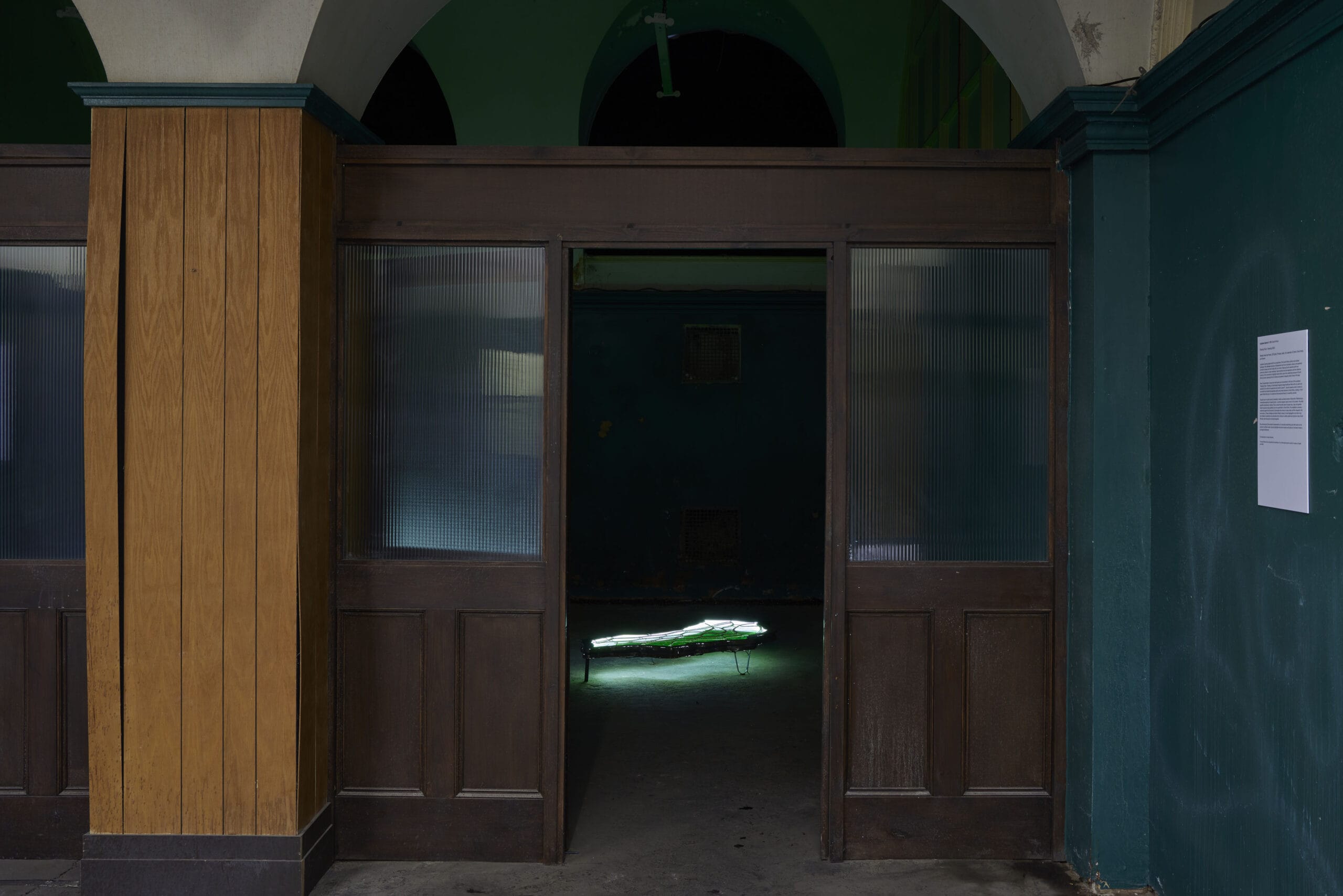 Lungiswa Gqunta grapples with the complexities of the South African cultural and political landscape. She addresses histories of displacement and how colonialism, slavery and apartheid continue to shape and inform daily life in her home. Featuring found materials which are commonly present in urban townships, Gqunta centres her own experience and the collective memory of her community to highlight cracks which rupture the underlying structure of South African society, exposing forms of violence and systemic inequality which remain rife today. Here, the parameters of secure and safe spaces are reconsidered in the form of her sculpture ‘Sleeping Pools – Brewing’, an illuminated irregularly shaped bedframe filled with ink, water and essential oil (to mimic the appearance and smell of petrol*). Gqunta questions what it means to rest within the divides that separates public and private domains in South Africa, creating a ‘third space’ where the luxury of a suburb and the perceived threat of a township coincide. Gqunta’s use of a petrol scent is intended to create a pervasive sense of discomfort. Referencing a homemade explosive, the petrol bomb – a common weapon used in acts of civil protest – the smell signifies revolutionary violence. This is a tactic the artist uses to expose race, class, and gender-based injustices at play globally, but more specifically in South Africa. The installation narrates a resistance against the structures of colonialism that remain in place today and the inequality that surrounds us. These privileges are directly linked to issues of racial segregation and other long-term effects of apartheid and colonialism that continue to subtly spread and imprison many South Africans, both physically and psychologically. By accompanying this symbolic representation of a suburban swimming pool with petrol as the symbol of political unrest, Gqunta highlights structural inequity and poses an imminent threat to privileged entitlement. Commissioned by Liverpool Biennial.