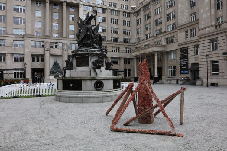 At Liverpool Biennial 2016, Rahal’s sculptures imagined artefacts from science fiction and popular culture thousands of years into the future, fossilised. These belong within a burgeoning mythology, which draws on characters from a range of sources, from local legend to science fiction. He encourages these indeterminate beings to emerge into our everyday lives, as if through cracks in our civilisation. The backdrop is a square behind the Town Hall that is often used by the film industry: it has been cast as New York several times, and once it was covered in snow, to represent Moscow. The sculptures also appear elsewhere throughout the Biennial exhibition.