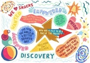 At various points throughout the workshops we were joined by artist Laura-Kate, who worked with the young people to transform some of the narratives and questions that we explored, as well as their feedback on the project, into visual minutes.